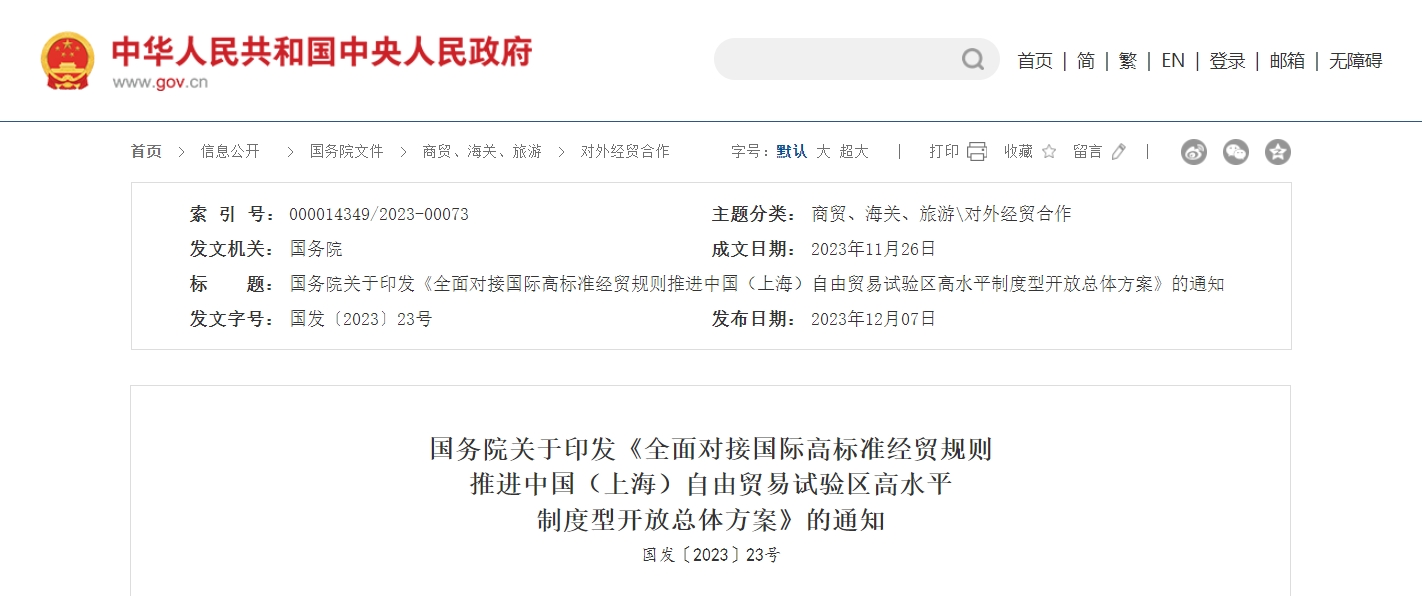 国务院关于印发《全面对接国际高标准经贸规则 推进中国(上海)自由贸易试验区高水平 制度型开放总体方案》的通知