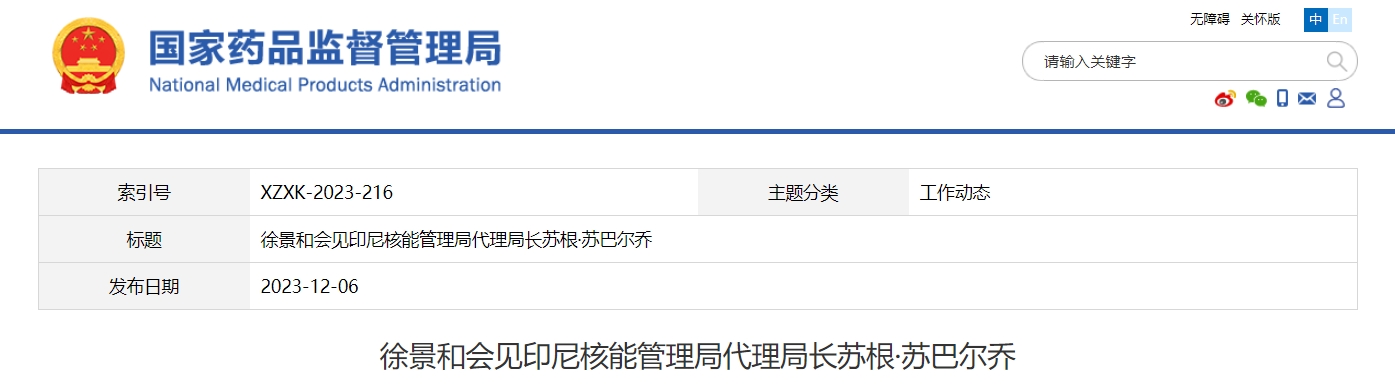 12月5日下午,国家药监局党组成员、副局长徐景和会见了来访的印尼核能管理局代理局长苏根·苏巴尔乔一行,就放射性医疗器械监管进行交流。